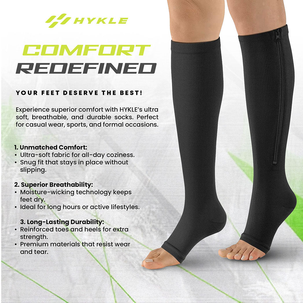 HYKLE Zip Compression Socks are designed to make wearing compression easier than ever. The integrated zipper lets you slip them on quickly, eliminating the frustration of tugging and pulling. Experience improved circulation, reduced swelling, and relief from leg fatigue—perfect for those with varicose veins, edema, or anyone needing extra support.